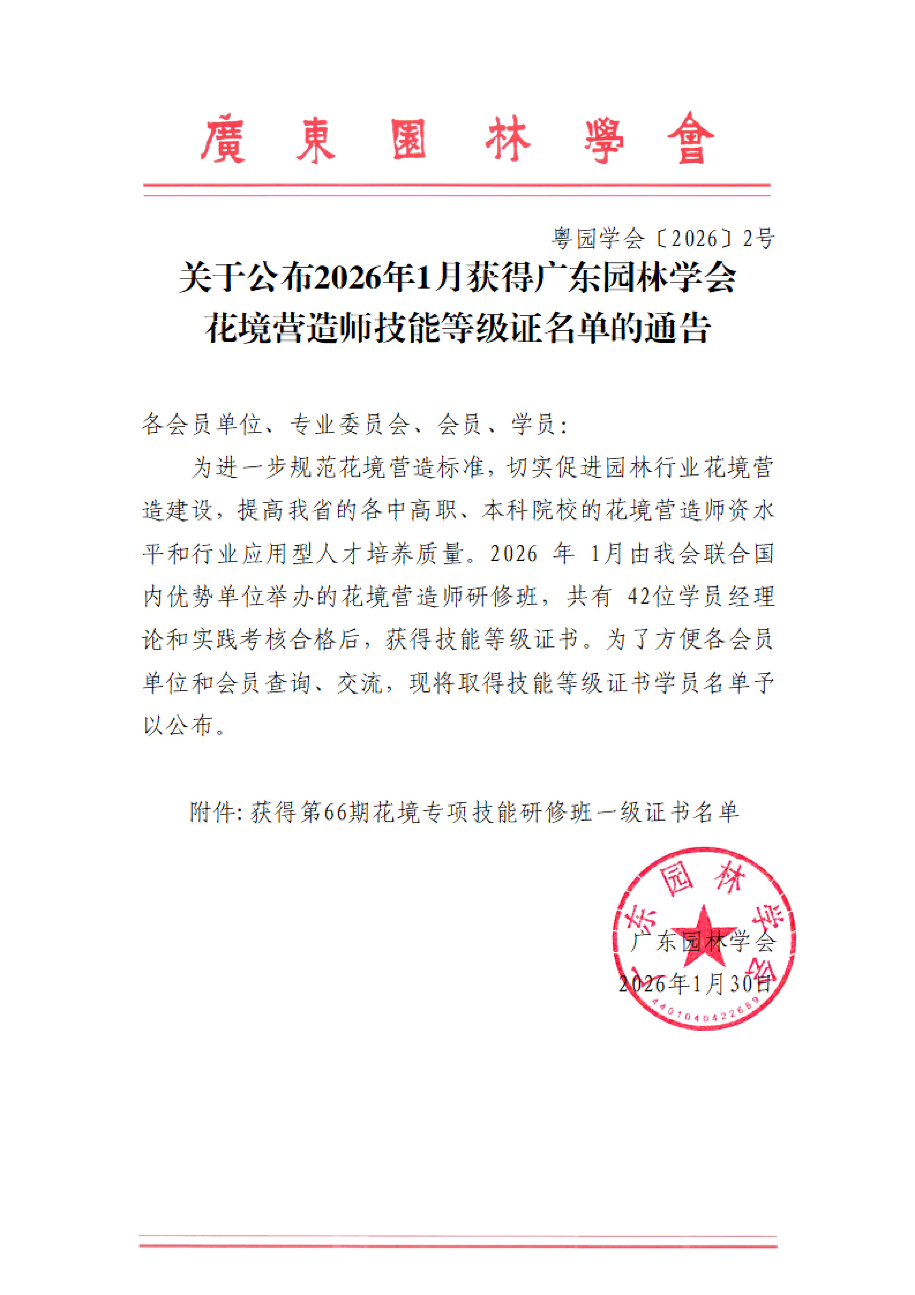 关于公布2026年1月获得广东园林学会花境营造师技能等级证名单的通告
