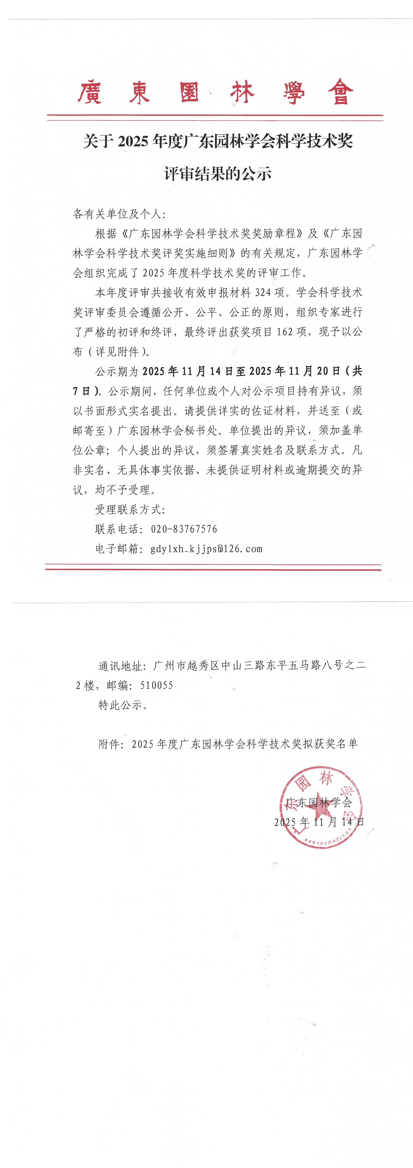 关于2025年度广东园林学会科学技术奖评审结果的公示